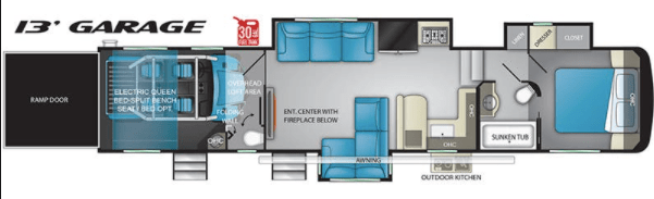 We decided to go back to a truck with trailer for safety. (There are no crash standards for motorhomes and no airbags. When the appliances, TV’s and cabinets start flying it gets ugly, fast. We all know how well they are attached……) And we wanted space, a lot, so that dictated a fiver. We like toy haulers for the storage in back and the completely separate guest quarters with head. The biggest beef with all the TH layouts out there was the sacrificing of the “conversation pit”. As little as one love seat with a large TV two feet in front of your face, or the linear 6 seater couch where all but two are staring at the kitchen island. (This was how our former Cyclone was and the feature I learned to hate the most). But there were a few layouts that actually had everything plus a living room. The Road Warrior 430 came out on top.