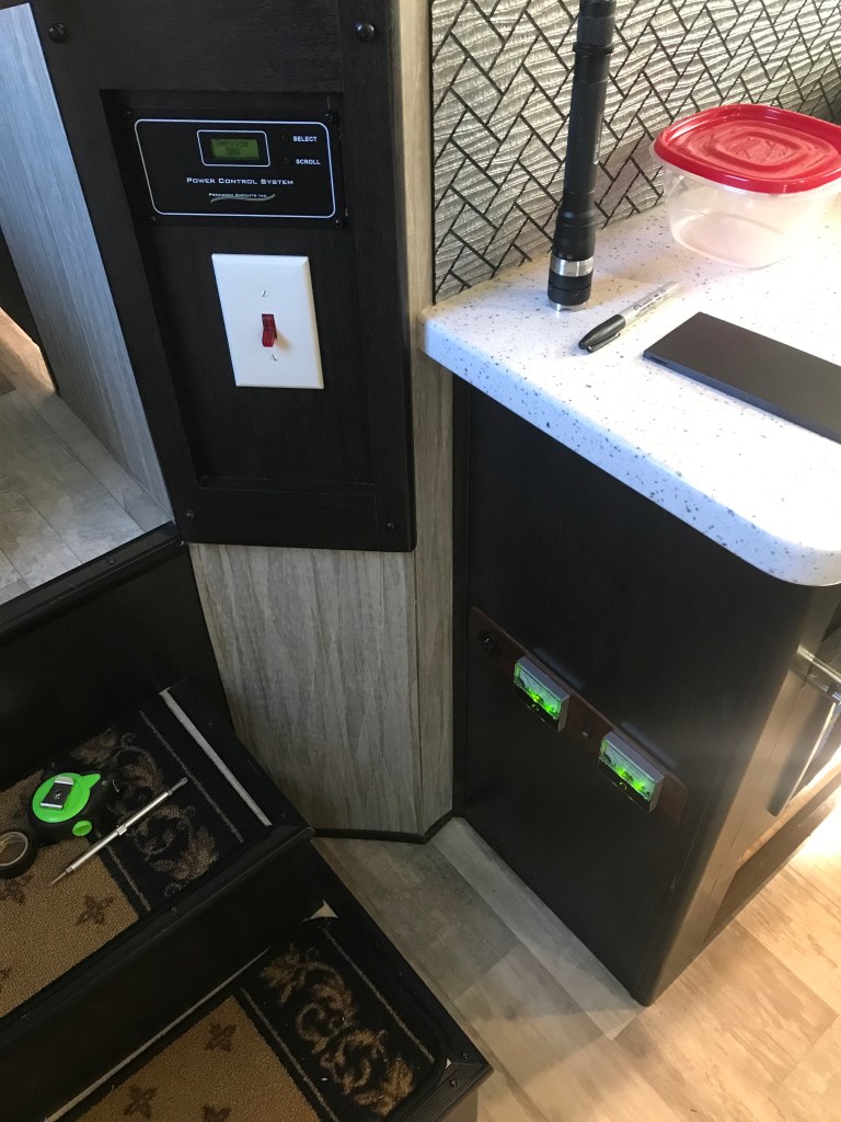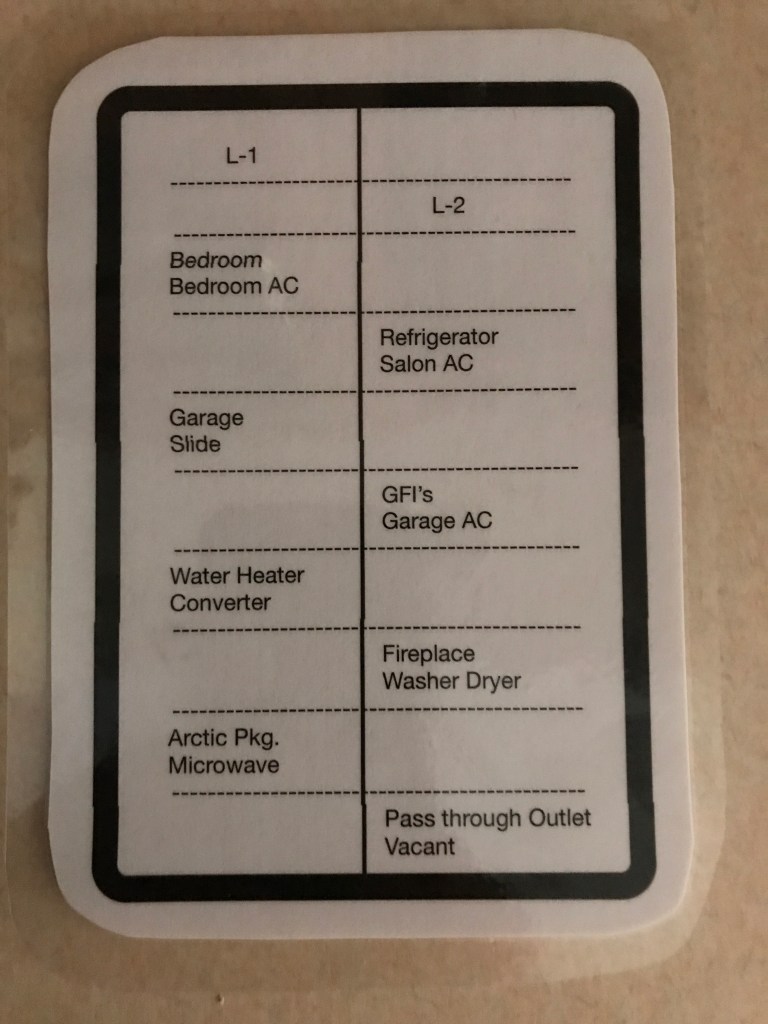 One more thing….. As stated above, there are two “legs” coming into the unit. Line 1 and Line 2. With 50A shore power available this is actually a total of 100A. Now, on 30A, or inverter it’s a lot less. And, at home I have two times 20A available from a welding outlet. So, it’s not only important to know how much everything draws, but also on which leg it is so you don’t turn on everything on one leg with only 20A coming in. Starting from the left they alternate….. L-1 and L-2