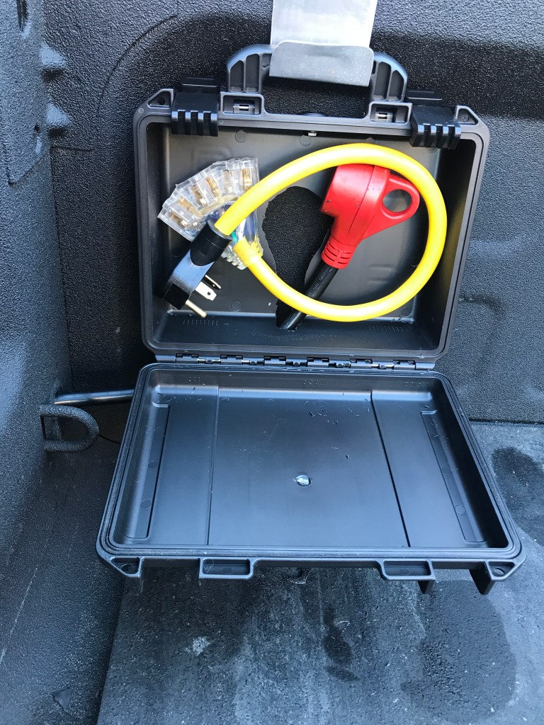 Lots of ways to do it, but again I didn’t want to drill a bunch of (large) holes for connectors etc. So, again, routed out the plastic outer storage tubs in the floor, into the bed through a hole with a nice rubber grommet in there. Cut the male end off a 30A RV extension cord so I have a nice sealed female plug, and the same with a male end for a 12/3 extension cord, good for 15A. For storage, and to protect against the elements I put them in little plastic water tight cases, except for the holes I made in the bottom, and I hung the cases on the truck bed wall with aluminum brackets. (Love the flat beak vice grips/hand break)