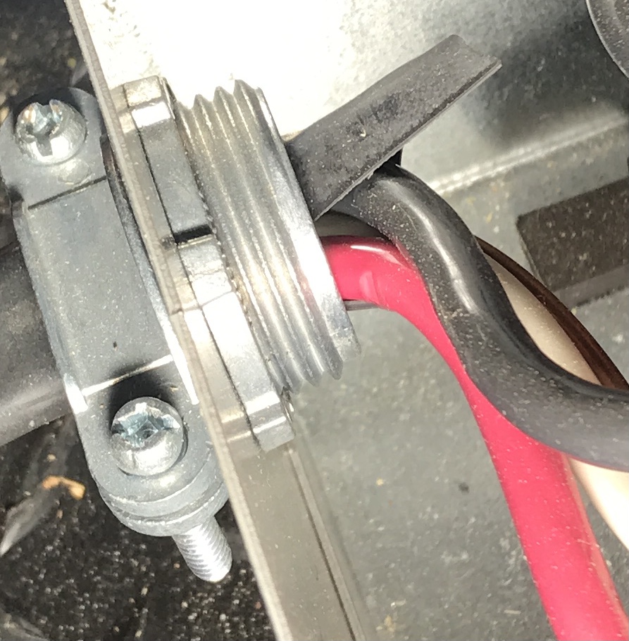 The fiver was a little more involved. First off the shore power connection is 45′ feet away in the back. So there and back would be 90′ of cable. Silly. Somehow I had to tie in to this. I decided to add another transfer switch as per the diagram, to select between Generator and Inverter. Priority is Generator over Shore over Inverter. This is standard procedure and similar diagrams as shown below are in the transfer switch manual. The original one is the grey metal box which I found with the lid off……(Ignore the yellow Romex.) In addition to that, the red hot lead coming out the bottom was chafing on the clamp and would have shorted out eventually and made life very “interesting”. In the pictures I have it pushed in and you can see the damage on the closeup.
