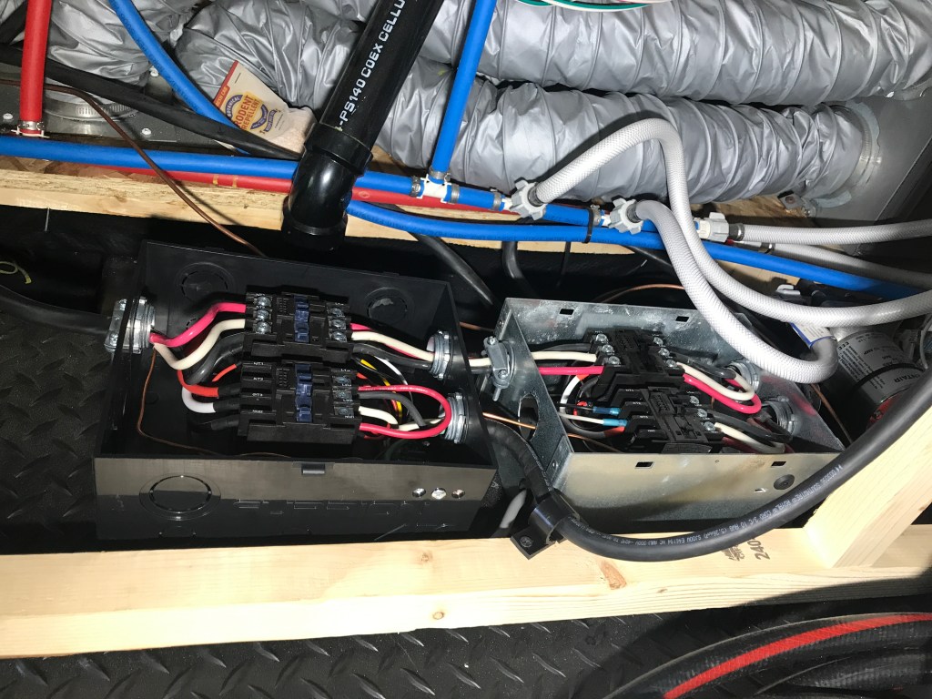 To provide power to the I/C for charging the LFP bank from the generator I added an outlet with a dedicated circuit in the pass through storage. (Hence the yellow Romex) While I was in the breaker panel I added two ammeters to help manage load.
