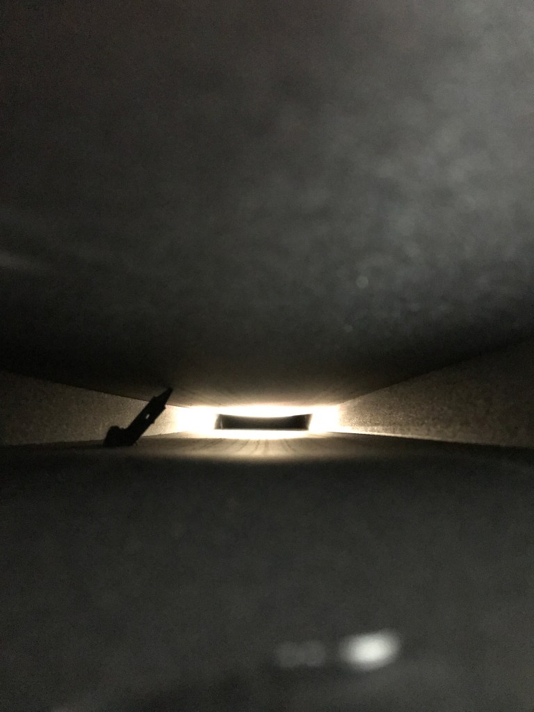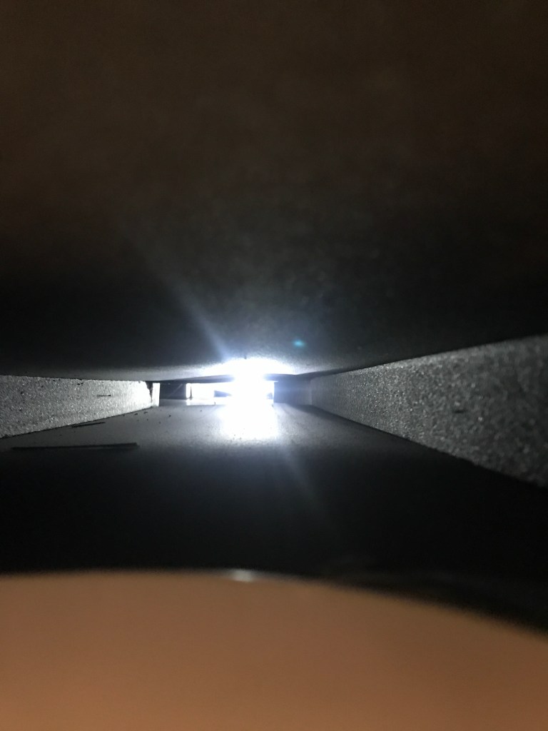 I sat in my spot for a long time looking at it all, and in the end I decided the “conduit” was right there….. the AC ducting. It’s made from foam board inside the roof. About 9″ wide inside, and 2 to 2-1/2″ tall. No sharp edges to chafe the speaker wires. Looks like this. (Inside Bathroom looking forward to flashlight which is in the duct through the door side register above the bed. The opening you see down and to the left is the connection to the bedroom AC) Relatively free of construction debris. I’ve seen worse, a lot worse.