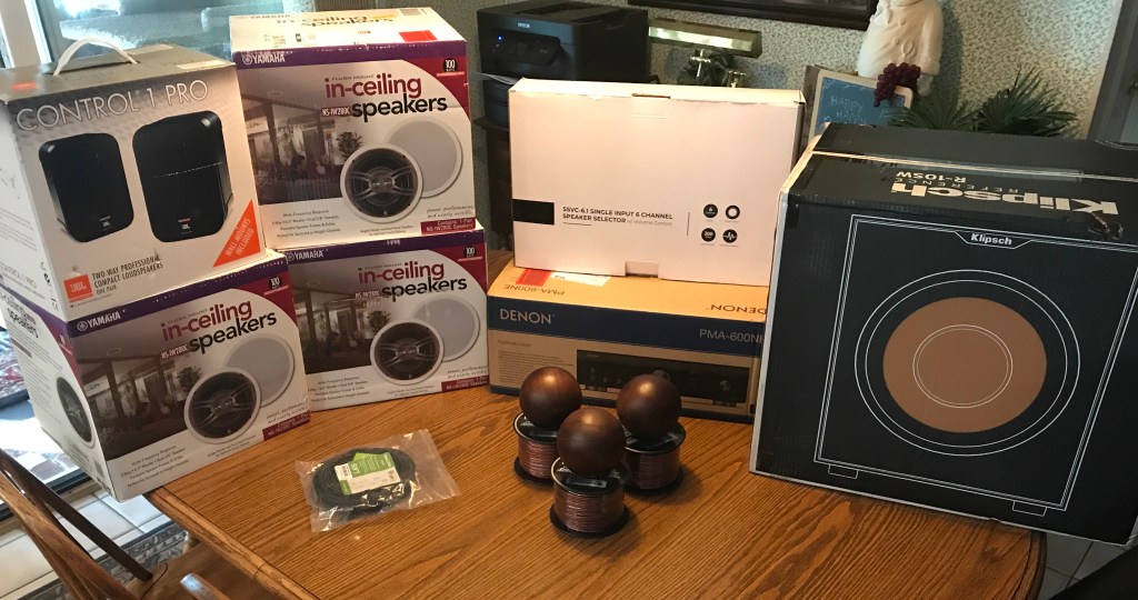 I spent a lot of time trying to cobble a combo wireless/wired (remember the speakers in the garage and outside) system with affordably priced gizmos but that got too complicated with a lot of questions about sound quality and reliability.