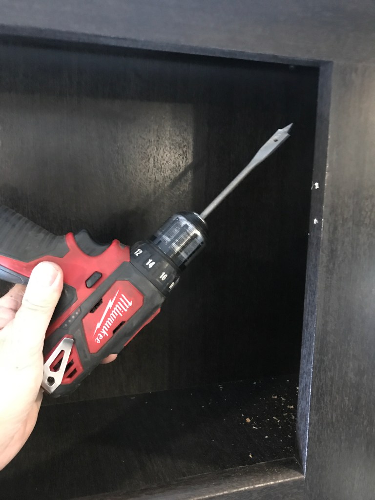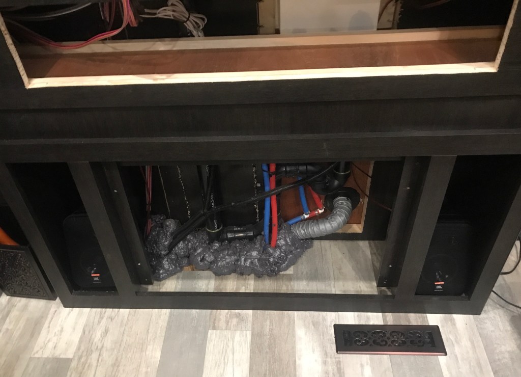 First things first: Demo. Glass plate on the fireplace lifts up and off…. (Hmmmm……) Four screws and the fireplace box comes out. Cord is plugged into an outlet in the garage and goes through a hole. Four screws and the Jensen with speaker combo was hanging on its wires. Labeled things and cut where needed. Five screws remove an upholstered piece of plywood (particle board more likely) on which the TV is mounted. LOVE this. Someone gave a shit and you can get to things easily! Then the cabinet doors above that. Silver? Really? And mat glass? Matches nothing…… So they are off. What goes back on is still in R&D in the “Cabinets” department. Note behind the fireplace all the plumbing for the WD. And no, I did not put that hole in there. But I’m gonna put in a lot more…..
