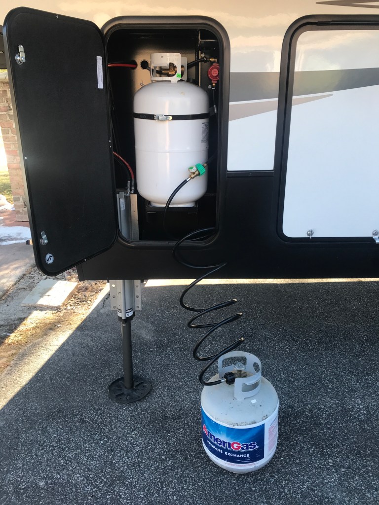 But first, I want to get as much heat as possible in there, and be comfortable, during load in. In the 20’s electric is not enough so (for now) the furnace needs to be running. But, I usually top off my two 30 pound gas bottles (there’s room to fit 40 pounders in there but that is going to take some grinding and welding) and I don’t want to use any of that before we leave. So I got this extension hose that fits on the hose that’s on the bottles in there, and I run 20 pounders (plenty of those in stock)………